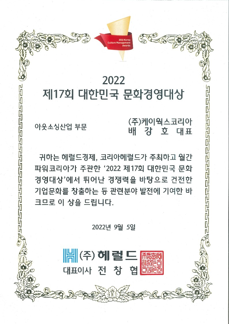 링크: 케이웍스코리아, 2022 대한민국 문화경영대상 수상 - 데이터넷 (datanet.co.kr)